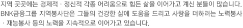지역 금융그룹이기에 그 누구보다 지역을 잘 이해하고, 함께 발전해 나갈 길을 알기에, BNK금융그룹은 지역의 곳곳을 찾아 사랑과 나눔의 의미를 임직원 모두가 내 고장을 위한다는 마음으로 적극 실천해 나가고 있습니다.